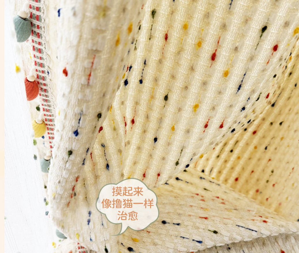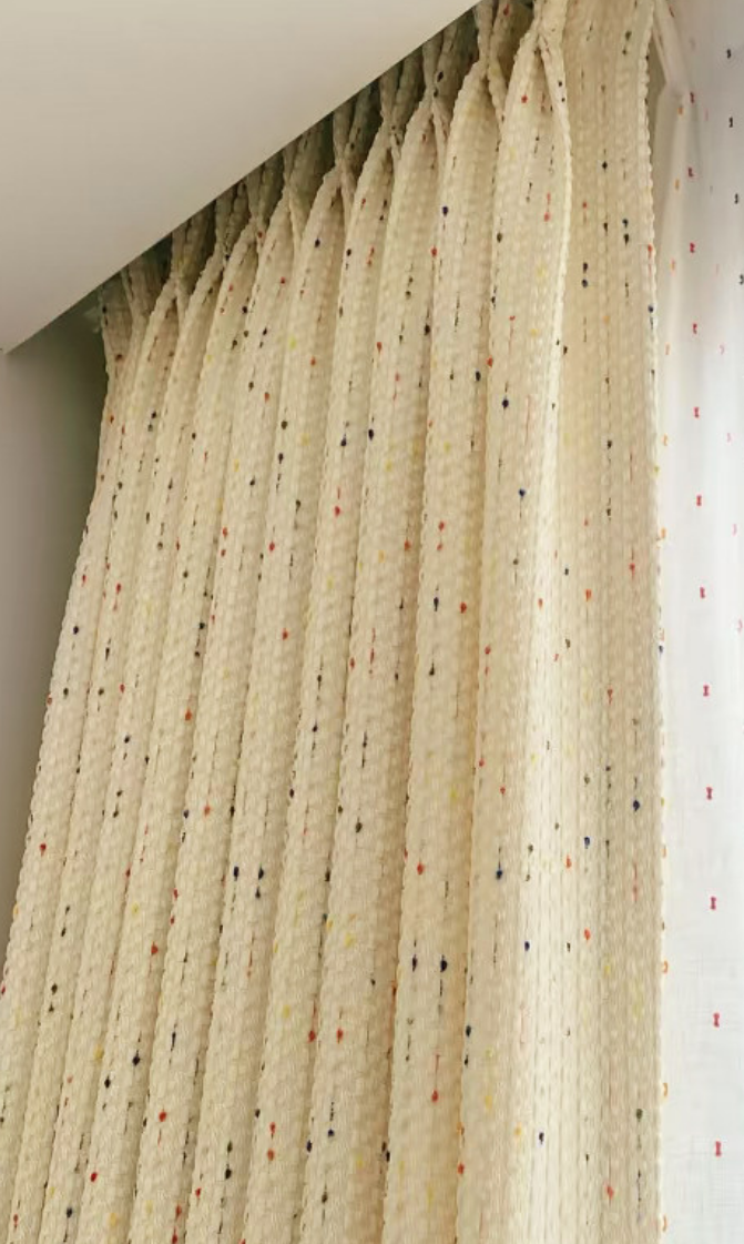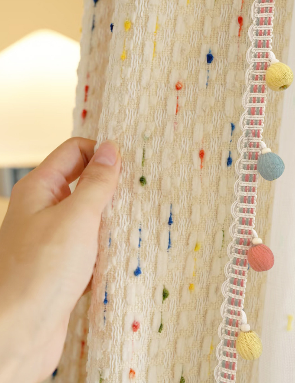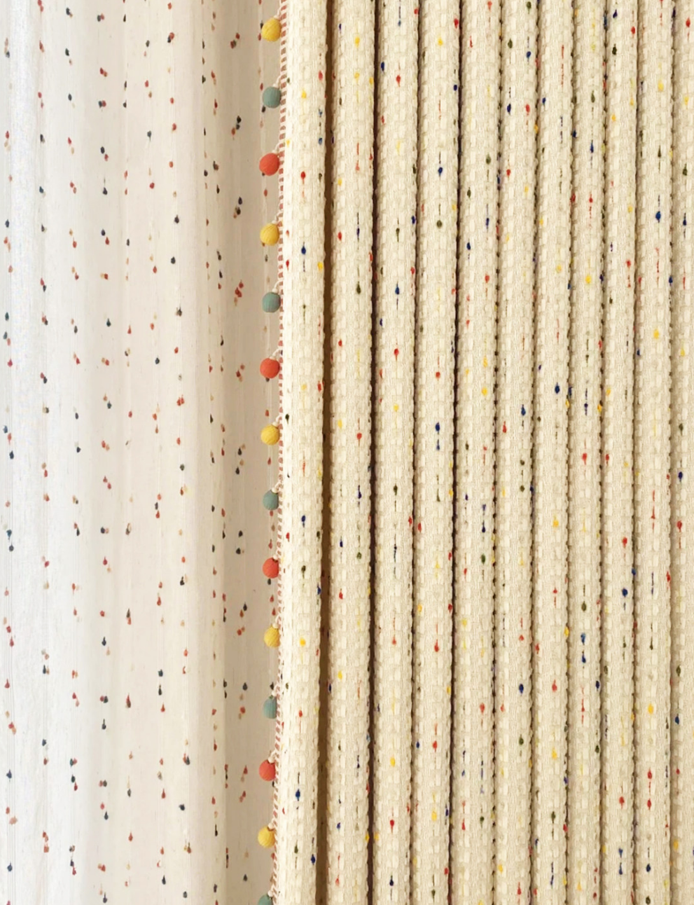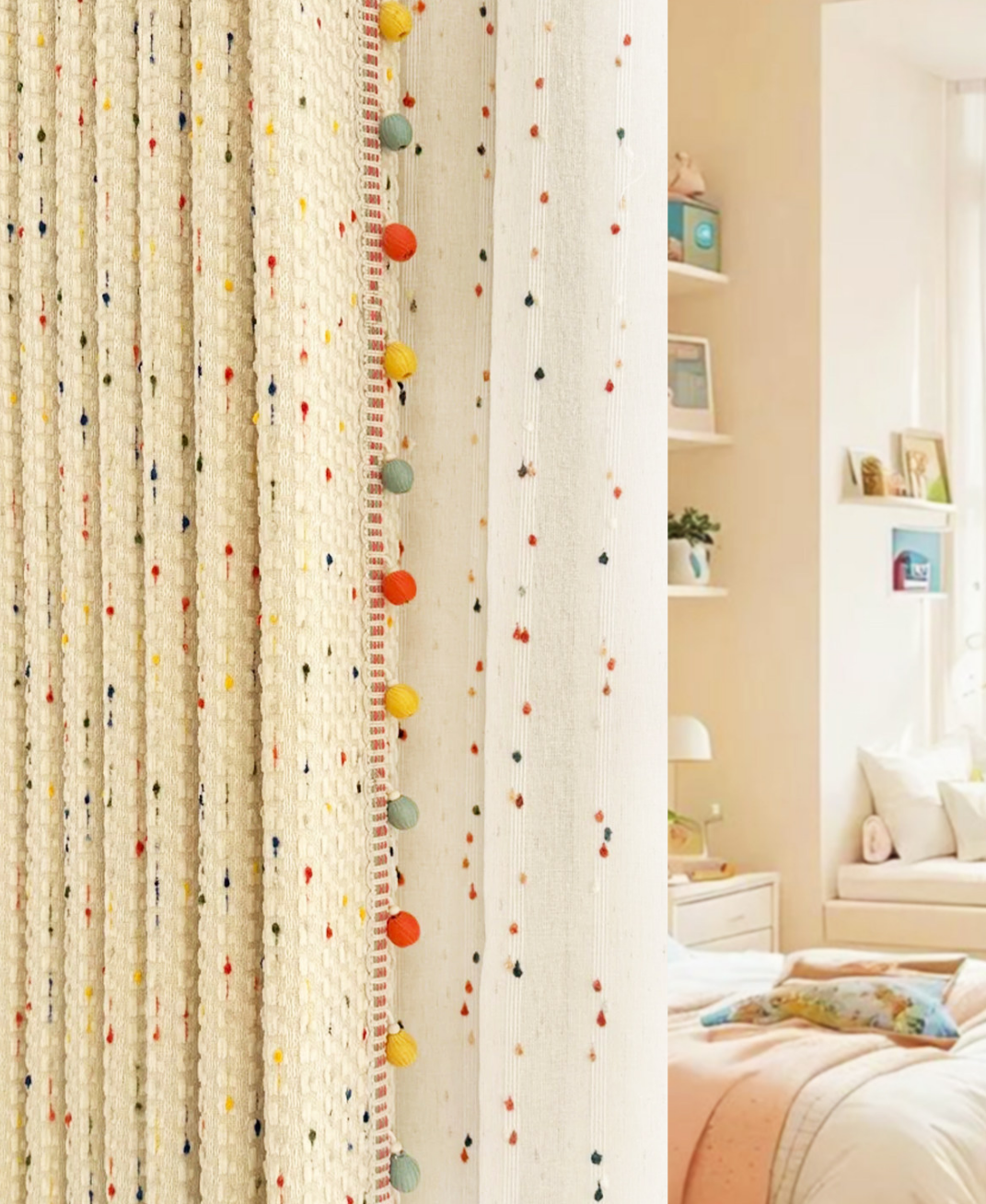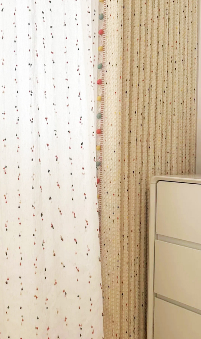 Voilage enfant blanc pois colorés pompons chambre joyeuse